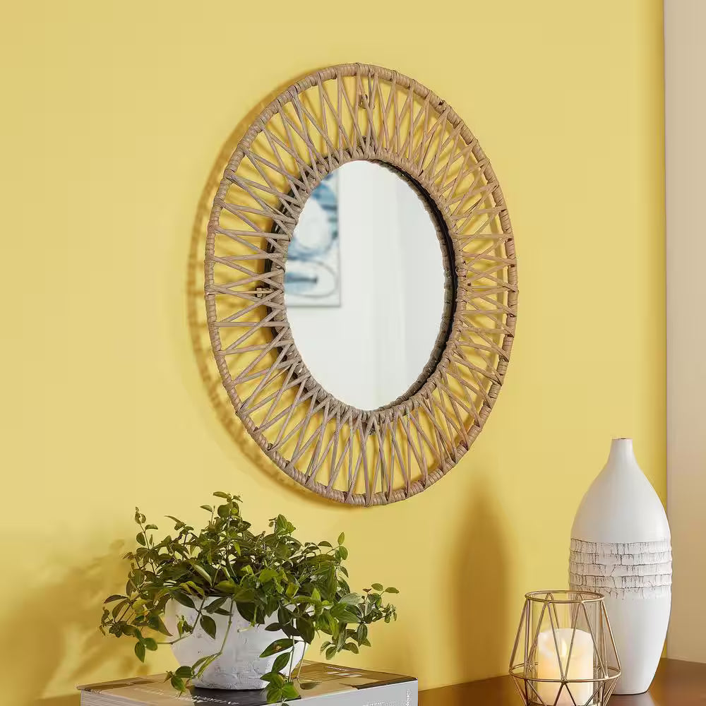 StyleWell Medium Round Brown Modern Accent Mirror with Polyrattan Braiding (24 in. Diameter)